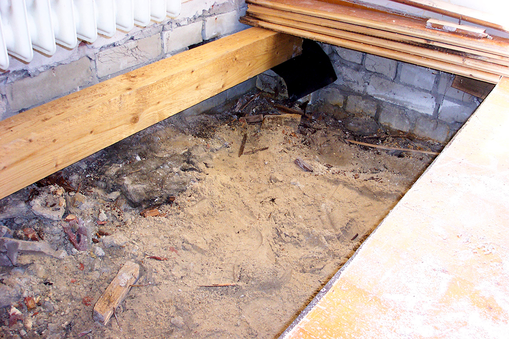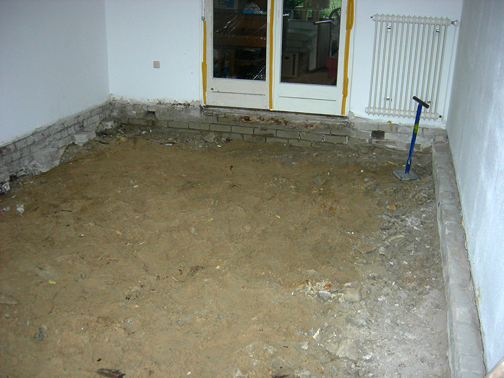Das folgende Foto zeigt den Fußbodenaufbau im Wohnzimmer noch einmal im Detail. Links ist ein erneuerter Tragbalken zu erkennen, der auf dem Mauervorsprung aufliegt. Darauf sind Bohlen mit Nut und Feder (Rauhspund) befestigt. Der Fußboden besteht aus einer Lage Rauhspund (im Foto sind 4 ausgesägte Bohlen übereinander gestapelt). Die Tragbalken faulen bei schlechter Belüftung, weshalb sie von Zeit zu Zeit ersetzt werden müssen, damit der Boden nicht einbricht. Einige Hausbesitzer haben inzwischen einen Betonboden gießen lassen, der nach unten gegen Kälte isoliert ist.