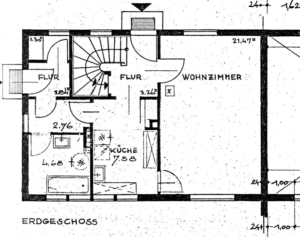 Unter den anderen Gebäudeteilen ist ein fester Boden (Beton?). Die Standardaufteilung im Ergeschoss besteht aus einem kleinen Windfang/Flur mit einer Gästetoilette, einem Flur (mit Treppe zum Keller und ins Dachgeschoss), dem Wohnzimmer, der Küche und dem Bad/Waschküche. Eingänge befinden sich seitlich am Windfang und vorne am Flur. Die Decke im Erdgeschoss besteht einer Ziegel-Einhängedecke mit Aufbeton. Unterhalb sind Heraklith-Platten angebracht. Zum Zimmer hin ist die Decke verputzt.