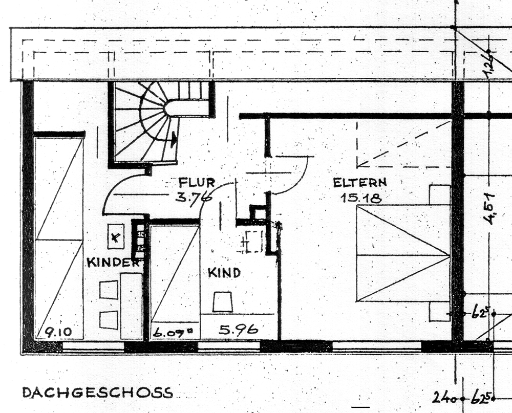 Das Elternschlafzimmer und das Kinderzimmer auf der gleichen Seite haben normale Deckenhöhe. Die Zimmer auf der anderen Hausseite haben eine Dachschräge, da das Dach bei den Doppelhäusern typischerweise an einer Seite tiefer gezogen ist. Die Decke im Dachgeschoss ist eine Holzbalkendecke, darunter Stabilrohrmatten mit Putz. Zwischen den Sparren zum Dachboden hin lagen lt. Bauplan 8 cm Mineralwolle (1.500-2.000 g/qm Mineralwolle) als Isolierung. Von außen ist das Dachgeschoss verklinkert, was den Häusern im Originalzustand das zweifarbige Aussehen gibt. Die Häuser haben einen über eine ausziehbare Bodentreppe begehbaren Spitzboden, der zu Lagerzwecken genutzt werden kann. Das Dach ist mit Betondachsteinen gedeckt, die auf einer Lattung aufliegen und mit dieser verklammert sind. Beim Bau wurde keine Wärmeisolierung vorgenommen. Die beiden Schornsteine (einer einzügig, einer zweizügig) sind aus Klinker gemauert.