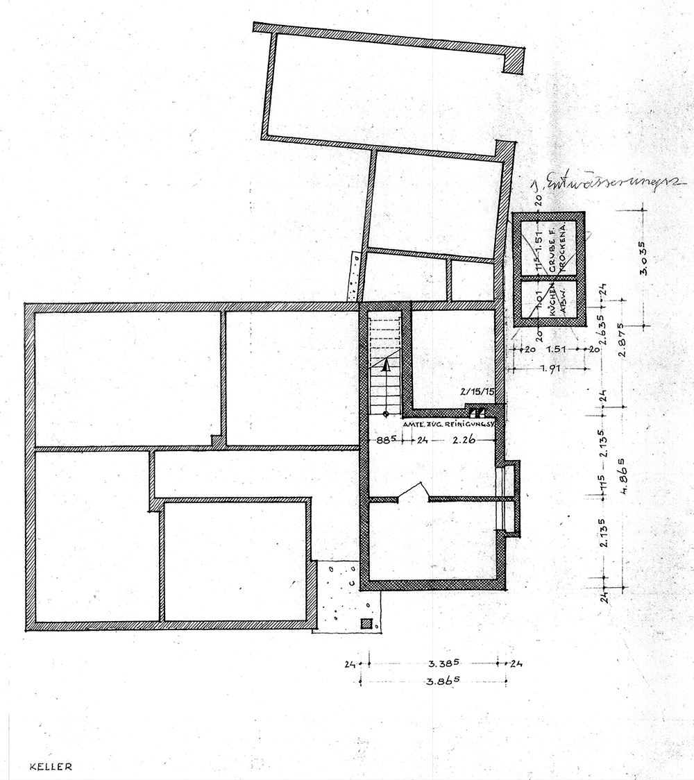 In der folgenden Abbildung ist fett schwarz umrandet der Grundriss des Kellers zu sehen. Links davon sieht man das Wohnzimmer mit der Balkenkonstruktion für den Boden. Über dem Keller befinden sich die Küche und der Flur mit den Treppen nach oben und unten. Rechts vom Keller der Gebäudeteil mit Flur und Bad. Der Erdaushub für den Keller und die Grundmauern war eine Arbeit, die in der Regel von den Bauleuten selbst ausgeführt wurde. Die Sohlhöhe lag 1,70 m unter Geländehöhe. Zu Beginn der Bauphase standen nur wenige Hilfsmittel in Form von Maschinen zur Verfügung. So wurden die Baugruben der ersten Häuser mit Schaufeln von Hand ausgehoben. Später standen zum Herausbefördern der Erde Fließbänder zur Verfügung. Die Mauern des Kellers wurden auf einem Streifenfundament errichtet.