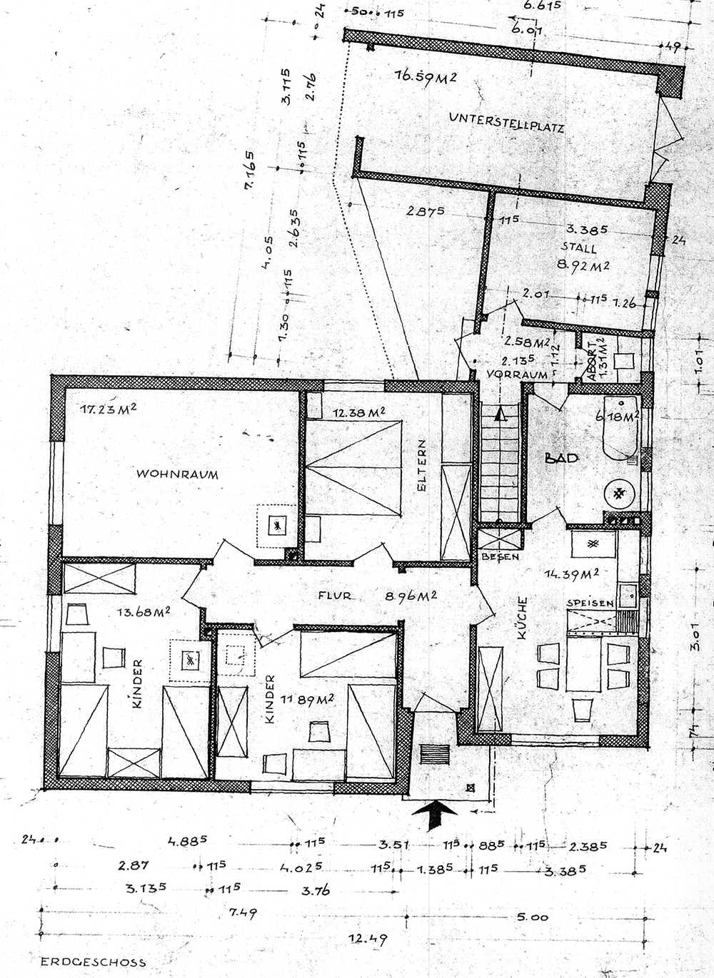 Die Decke des Kellers wurde aus etwa 12 cm dickem Beton – mit Baustahlgewebe-Lagermatten bewehrt – gegossen. Darauf kamen 4 cm schwimmender Estrich. Der Keller besteht aus 2 kleinen Räumen (7 qm bzw. 9 qm) und befindet sich mittig unter dem Haus. Vorne und hinten befindet sich jeweils ein Lichtschacht zur Belüftung. Diese Schächte sind eine Schwachstelle, da sie oft nicht genügend nach außen abgedichtet sind oder einfach Risse haben. So kann sich bei Regen oder bereits bei hohem Grundwasserstand im Schacht Wasser sammeln und in den Keller fließen. Auf Kellerniveau wurde auch die Grube für das Abwasser angelegt. Rechts und links vom Keller wurde ein Baugrund aus gestampftem Sandboden etwa in 2/3 Höhe des Kellers angelegt. Auf einem Streifenfundament wurden die Außenmauern errichtet. Dabei wurde die Wand zwischen den beiden Doppelhäusern mittig auf der Grundstücksgrenze als gemeinsame Wand angelegt. Hier befindet sich auf beiden Seiten das Wohnzimmer. Da der Aufbau des Bodens im Wohnzimmer für die damalige Zeit typisch ist, in heutiger Zeit aber oftmals eine Schwachstelle des Hauses darstellt, gehe ich im Folgenden näher auf den Bodenaufbau ein. In die gemeinsame Mauer sind auf beiden Seiten jeweils 9 Mauer“vorsprünge“ gemauert, auf denen die Balken aufliegen, die den Wohnzimmerboden tragen (s. Abb. 9). Hier auf dem Bild mit dem linken Pfeil markiert. An der rechten Bildseite ist ein „Mäuerchen“ zu erkennen, das ebenfalls als Balkenauflage dient. In der Mitte wurde der Fußboden in Längsrichtung von einem weiteren Balken unterstützt.