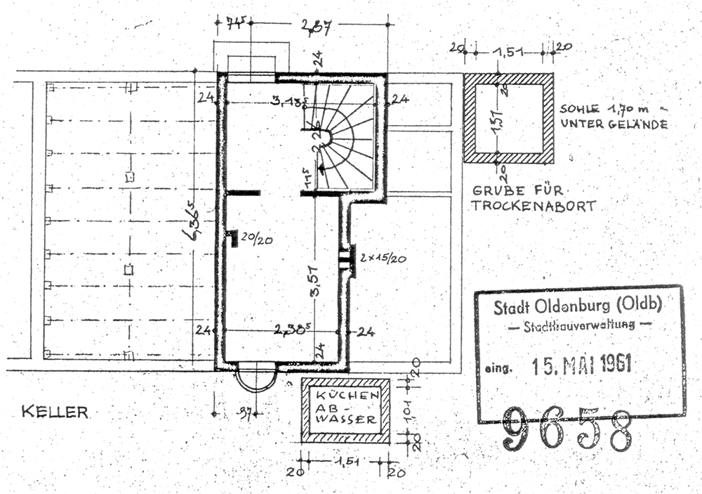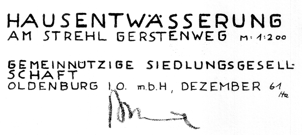 Allen Haustypen gemeinsam ist die Hausentwässerung über Klärgrube und Verrieselung. Küche, Bad und WC liegen bei den Einzelhäusern nebeneinander auf der Gartenseite der Häuser. Auf Plänen aus den Jahren 1959 und 1961 befindet sich eine Grube vor der Küche mit der Bezeichnung Küchenabwässer. Vor dem WC liegt eine weitere Grube mit der Bezeichnung Grube für Trockenabort. Ein Jahr später (1962) ist eine Kleinkläranlage (Dreikammersystem) eingezeichnet. In einer späteren Version der Pläne ist mit Datumstempel 30. August 1976 von Hand der Anschluss an die öffentliche Kanalisation (PVC-Rohr und Revisionsschacht) eingezeichnet (teilweise zu erkennen am linken Rand in Abb. 4). Laut Entwicklungsplan Ofenerdiek (Der Oberstadtdirektor, 1975) war der Bau der Kanalisation im Bereich für 1975 geplant. Die Abwässer aus Küche, Bad und WC wurden in die Grube geleitet. Diese bestand auf der dem Haus zugewandten Seite aus einer großen Kammer, dahinter lagen nebeneinander zwei halb so große Kammern. Zuerst kam das Abwasser in die große Kammer. Dort konnten sich die festeren Bestandteile absetzen (Absetzbecken). Dieser Fäkalschlamm musste von Zeit zu Zeit entfernt/abgefahren werden, sofern er sich nicht von selbst auflöste. Dann durchlief das Abwasser die beiden anderen Kammern, wo sich weitere Bestandteile absetzen konnten, und im Abwasser enthaltene organische Schmutzstoffe durch Faulprozesse abgebaut wurden. Das so vorgereinigte Abwasser gelangte anschließend in einen Verteilerschacht und wurde über Verrieselungsgräben auf dem Grundstück verteilt.
