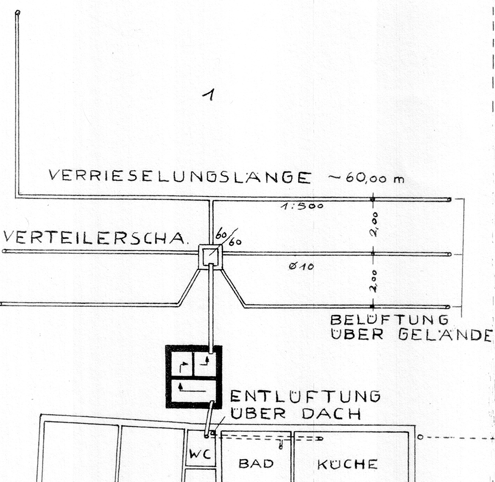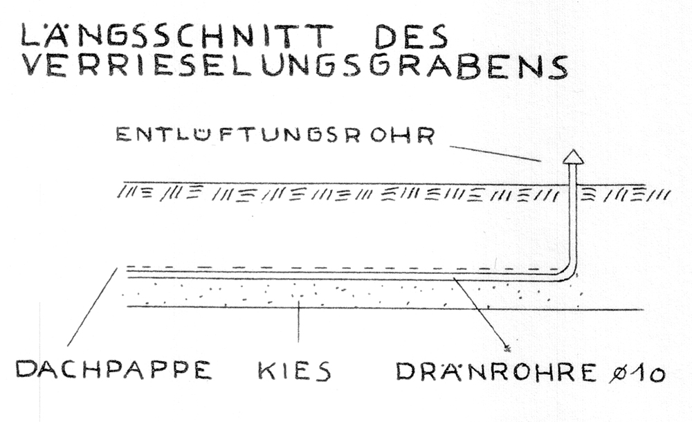 Anmerkung: Auch hier wurde 1961 der Name Gerstenweg benutzt. Die folgende Abbildung zeigt die komplette Entwässerungsanlage mit den Abflüssen aus dem Haus, der Grube, dem Verteilerschacht und etwa 60 m Verrieselungsgräben mit einem Gefälle von 1:500. Dafür war ein ausreichend großes Grundstück Voraussetzung, für eine 4-5-köpfige Familie etwa 1.000 qm.